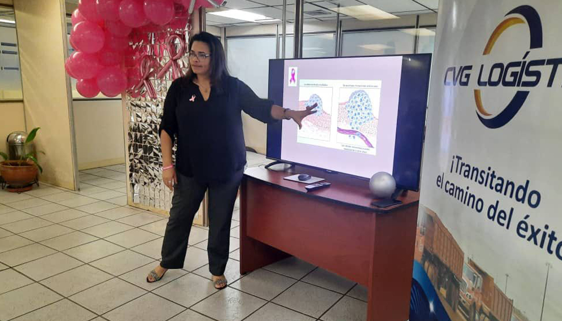La estatal CVG Logística (CVGL) en el marco de Octubre Rosa, se unió a la campaña de prevención y sensibilización contra el Cáncer de Mama, con el fin de educar a la población trabajadora femenina sobre la importancia del autoexamen mamario. La Gerencia de Salud y Gestión Ambiental llevó a cabo la realización de una jornada de inducción que contó con la ponencia de la Dra. Merlis Gómez, Gineco-Obstetra y la Psicóloga Ruth Salazar, Coordinadora de Compensación y Empleo de la institución.